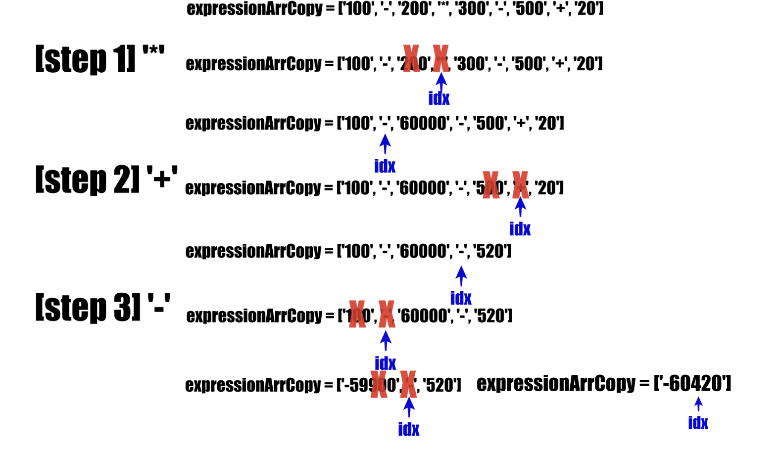 // 첫 번째 피연산자와 연산자를 remove하고 idx도 -2해주기