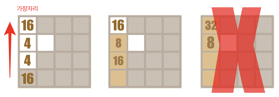 - 그리고 합쳐진 위치에서 연속으로 합쳐질 수 없고, 한 블록을 넘어서 합쳐질 수도 없습니다.