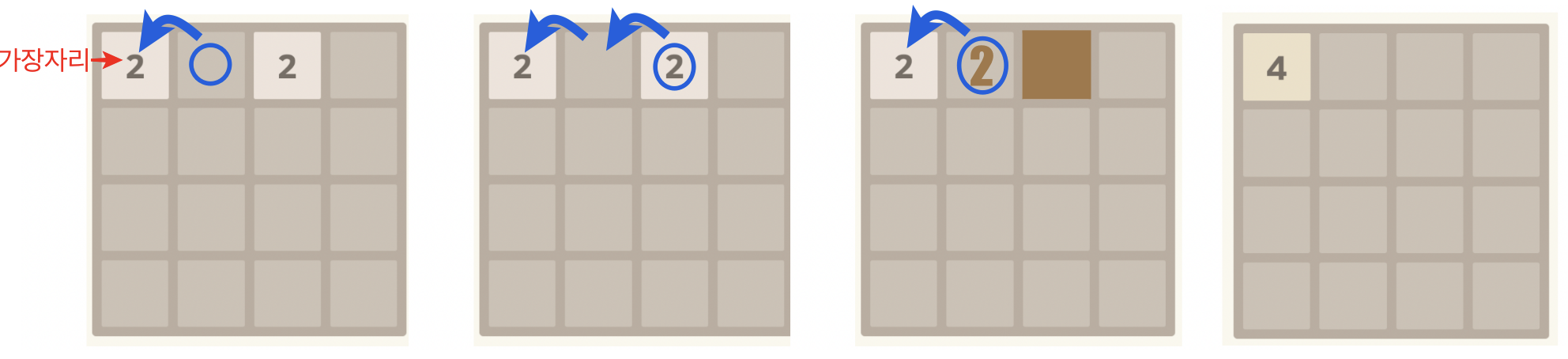 - 여기서 주의할 점은 중간에 0이 여러 개 나올 수 있으므로 0과 자리를 스왑 할 때는 continue를 하고, 병합할 때는 한 블록을 넘어서 병합을 또 하면 안 되므로 병합 코드는 끝에는 break로 끝내 주어야 합니다.